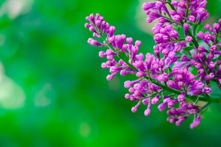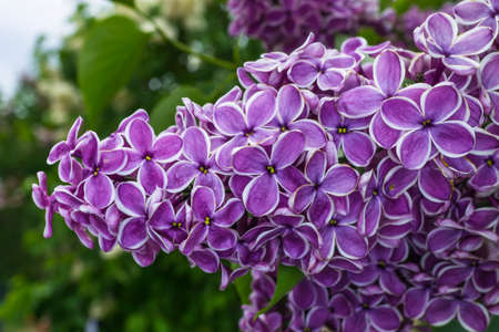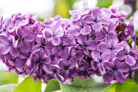 Blossoming branch of fresh purple violet lilac flowers close up, selective focus. Beautiful fresh purple lilac flowers in full bloom in the garden against green leaves natural background, close up.