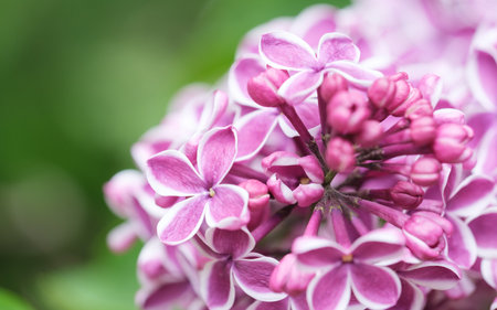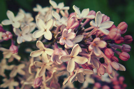 Close-up of lilac bush buds, flowers and leaves. Colorful spring nature background. Selective focus