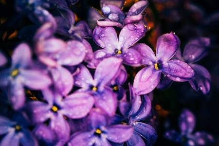 lilac flowers on a dark background at sunset close-up in drops of dew