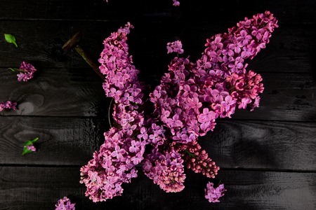 Beautiful lilac flower bouquet in metal watering can or watering pot on black background. Spring. Woman or Mother Day. Greeting Card. Gardening concept, top view, flat lay, copy space.