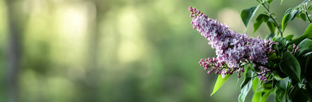 beautiful branch of lilac flowers on a dark green blurred background. long natural banner. concept for spring greetings. space for text