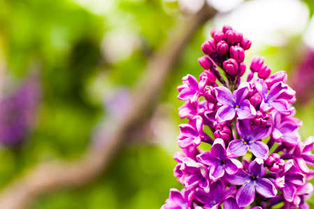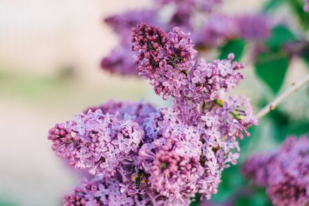 Branch of blossoming purple lilac in a spring garden. Selective focus.