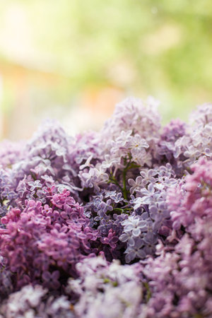 Close-up of bouquets of lilac flowers in full bloom, gorgeous lilac color and floral fragrance.