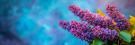 Purple Lilac Flowers Bouquet on Abstract Blue Background, Springtime Floral Backdrop with Copy Space