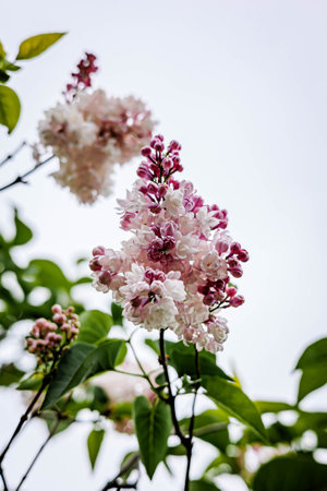 Delicate pink and white lilac flowers blooming in soft spring light against a pale sky. A minimal and romantic floral scene capturing the freshness and calm of the season
