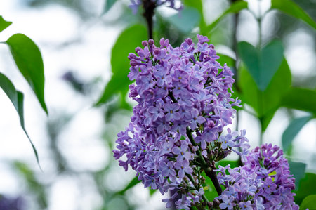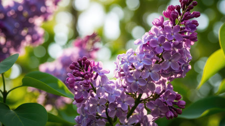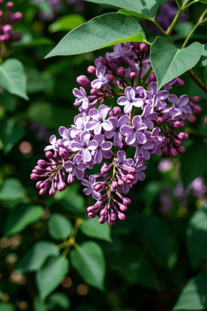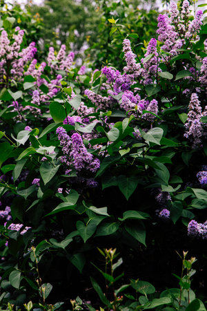 Lush green foliage surrounds blooming lilac flowers creating a vibrant and colorful display during springtime.