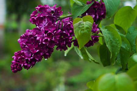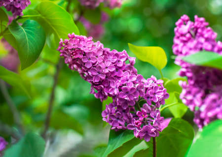Branch of blossoming purple lilac in a spring garden. Selective focus.