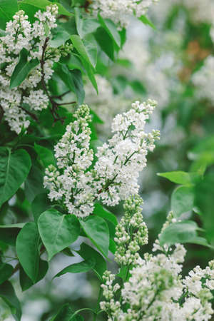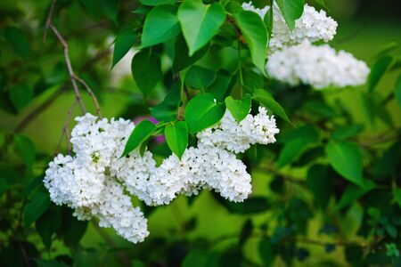 White lilac flowers with green leaves. Shallow depth of field. Selective focus.