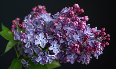 Generative AI : Branch of lilac flowers with green leaves floral natural vintage hipster background