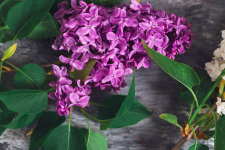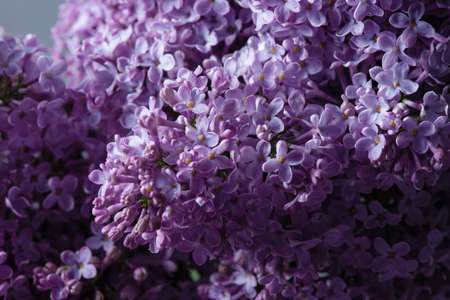Fresh branches of lilac flowers close-up on a blurred background, spring background.