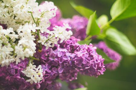A bouquet of lilacs. Close up. Beautiful purple violet blooming lilac flowers. Greeting card.