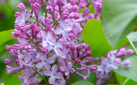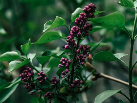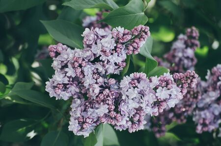 Close-up of lilac bush buds, flowers and leaves. Colorful spring nature background. Selective focus