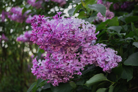 Syringa vulgaris blooming plant. Fragrant purple lilac bush in the spring garden in countryside