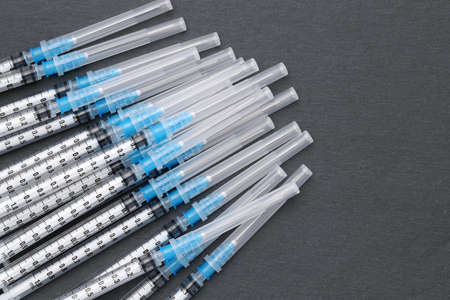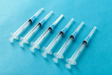 Disposable medical hypodermic syringes on a blue background. Copy space.