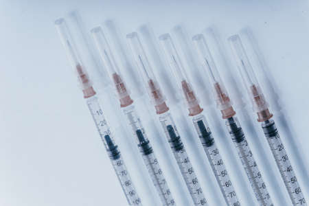 Medical syringes for injections lying isolated over light background. Injection medicine concept. Selective focus. Horizontal shot