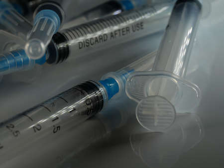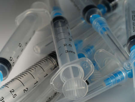 Several syringe on white table prepared for injection in hospital, selective focus, DOF, macro