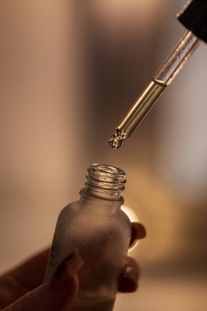 Woman is holding a bottle of oil and a pipette, close-up. beauty and cosmetics
