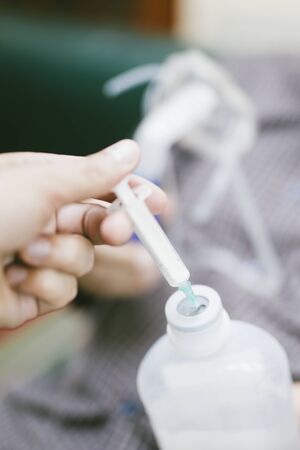Close up doctor hand injection bottle for saline IV drip Infusionwith IV solution for patient in ward hospital.
