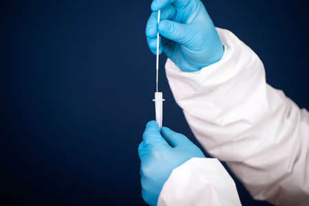 Medical healthcare holding COVID-19, coronavirus swab collection kit, wearing protective suit