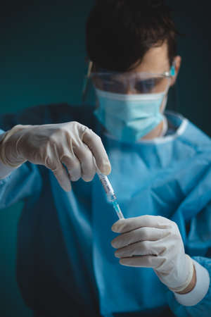 doctor in a sterile protective suit with a shield on his head prepares a syringe with a Covid-19 vaccine for an incoming patient. Medical worker. Fighting a pandemic.