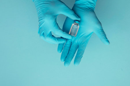 Doctor or nurse wearing blue surgical gloves holding a single vaccine dose