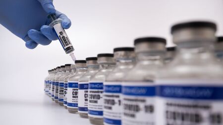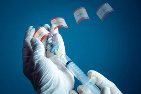 Covid-19 Corona Virus 2019-ncov vaccine vials medicine drug bottles syringe injection blue nitrile surgical gloves. Vaccination, immunization, treatment to cure Covid 19 Corona Virus infection Concept
