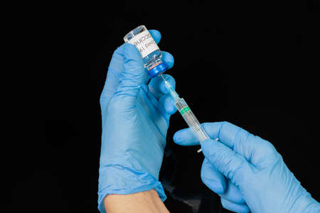 Vertical close-up studio shot of unrecognizable doctor in blue gloves holding and filling up vaccine to syringe on black isolated background. Nurse preparing to give injection of coronavirus vaccine.