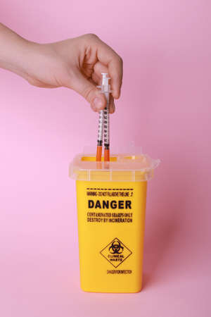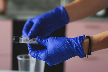 Nurse performing a blood test to check if the patient has coronavirus. Insert a syringe into the test tube.