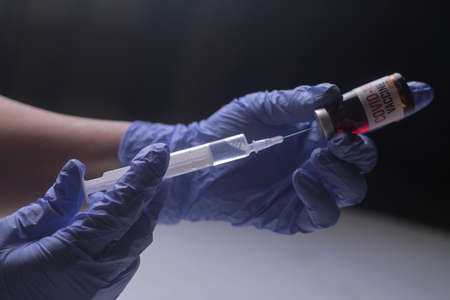 A man's hand wearing medical gloves. Using a cyring inserted into a vaccine bottle against a blurry background.