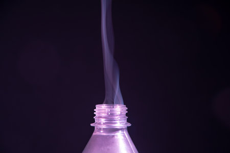 Smoke coming out of a plastic bottle against a black background. design element. Aromatherapy.
