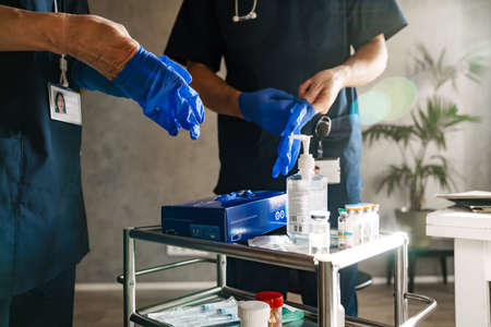 Close up of two doctors sterilizing hands before surgery in the medical cabinet