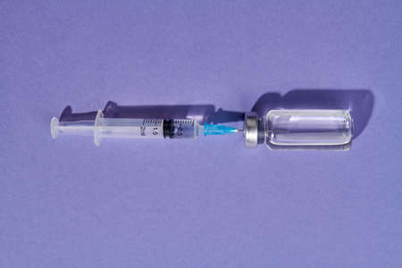 Close up syringe needle injected into medical vial bottle. Isolated on purple background.