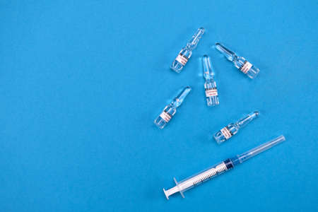 Two medicine ampule with anti covid sars vaccine and syringe on blue background