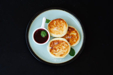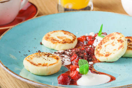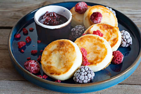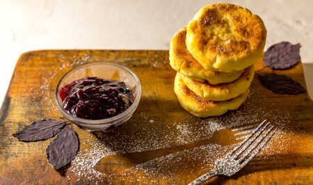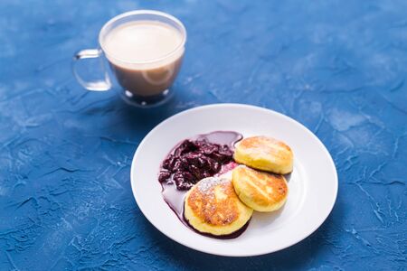 Cheese pancakes, homemade traditional Ukrainian and Russian matches, selective focus. Cheesecakes on a plate. Cheese pancakes or cheesecakes with berry jam.