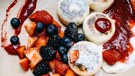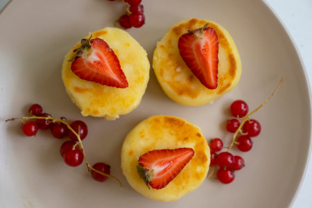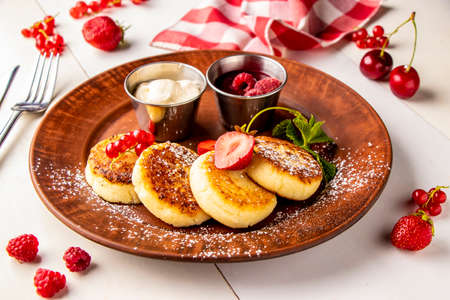 Cottage cheese pancakes, ricotta fritters or syrniki with currant and strawberries. Healthy and delicious morning breakfast