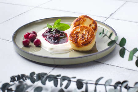 Cottage cheese pancakes, syrniki with fresh berries and jam for breakfast on tile with eucalyptus