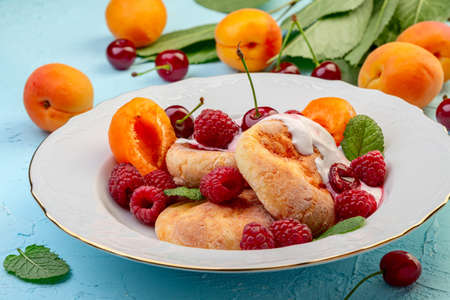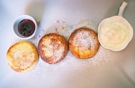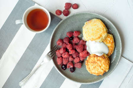 Fresh breakfast with cottage cheese pancakes with sour cream and raspberry jam