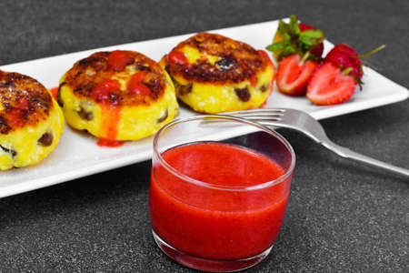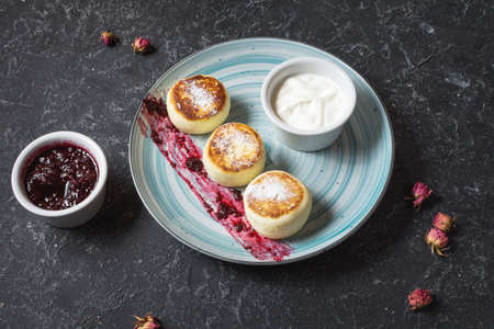 Macro photo of delicious bright cheese cakes with jam and sour cream on a dark plate in a restaurant