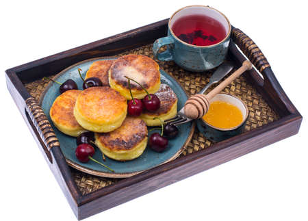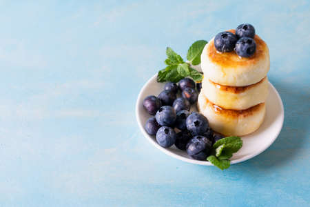 Cottage cheese pancakes. Cheesecakes from cottage cheese, delicious Breakfast, traditional Russian sweet pancakes. With blueberry, mint and honey.