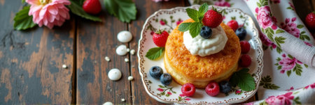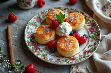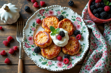 Delicious syrniki with fresh berries and whipped cream on a floral plate. That the image is generated using AI.