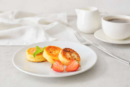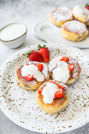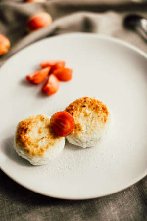 Cottage cheese pancakes, ricotta fritters on ceramic plate with fresh strawberry. Healthy and delicious morning breakfast. Gray concrete background.
