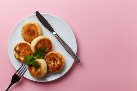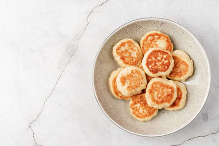 cheesecakes breakfast or dessert syrniki curd cottage cheese pancakes. healthy meal top view.