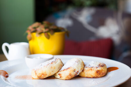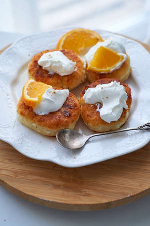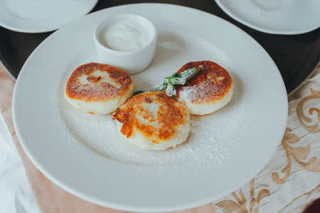 Cheese pancakes with sour cream on a white plate. Breakfast