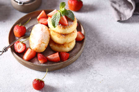 Russian syrniki or cottage cheese fritters or pancakes served with strawberry on concrete background. Breakfast