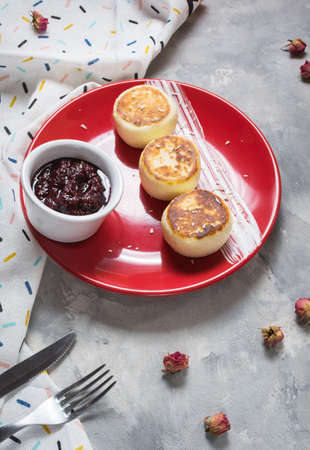 Cottage cheese pancakes on concrete background. Syrniki with jam. Homemade