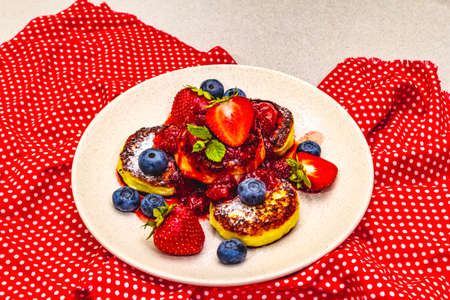 Cottage cheese pancakes with fresh berries and strawberry sauce. Healthy breakfast concept. Ripe blueberry, fragrant mint leaves, red polka dot napkin. Stone concrete background, close up