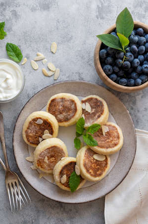 Cottage cheese fritters, ricotta pancakes with sour creamand bleberries. Healthy food. Top view