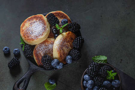Homemade pancakes with cottage cheese on a dark lantern with black currants and cranberries. Breakfast for the whole family. Healthy vegan food concept. Copy space.