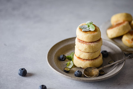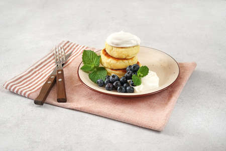 Cottage cheese pancakes, syrniki, curd fritters with fresh blueberries and sour cream on gray background. Side view, copy space for text. Russian breakfast menu