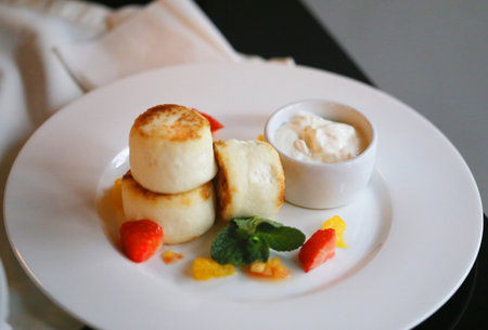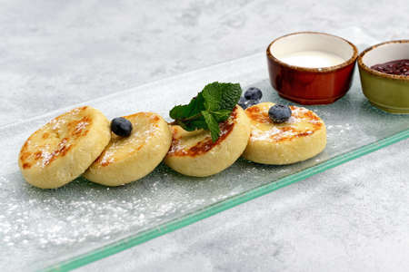 Cottage cheese pancakes with sour cream and cherry jam, restaurant serving